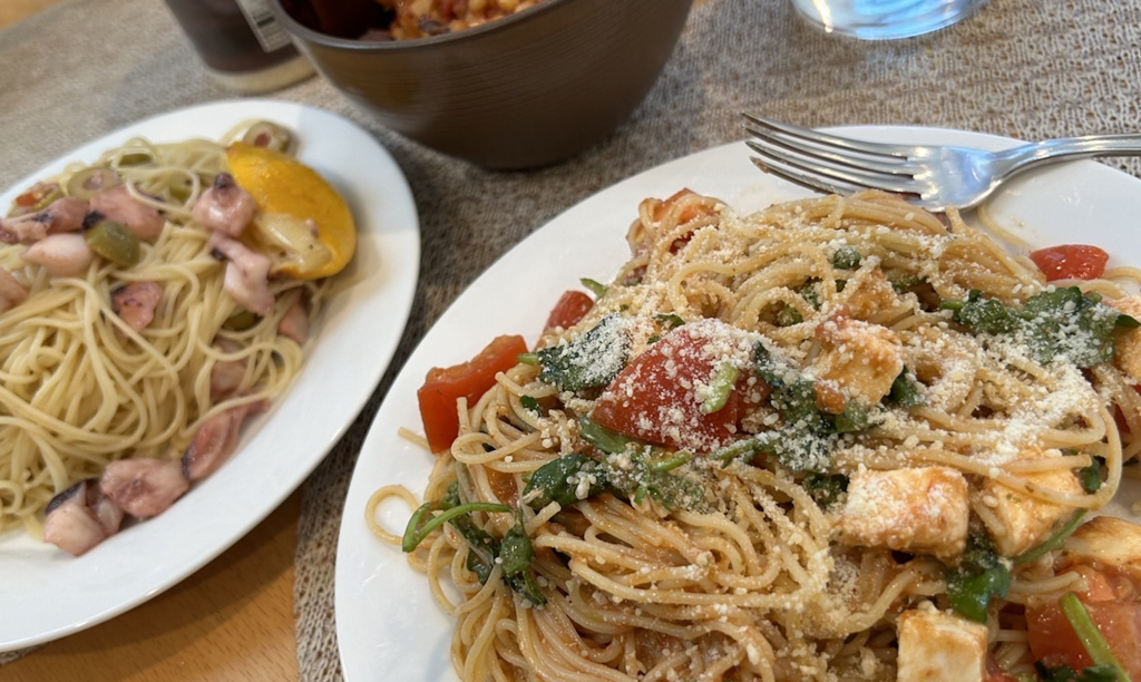 写真:タコとオリーブのオイルパスタとルッコラとモッツァレラのトマトパスタ