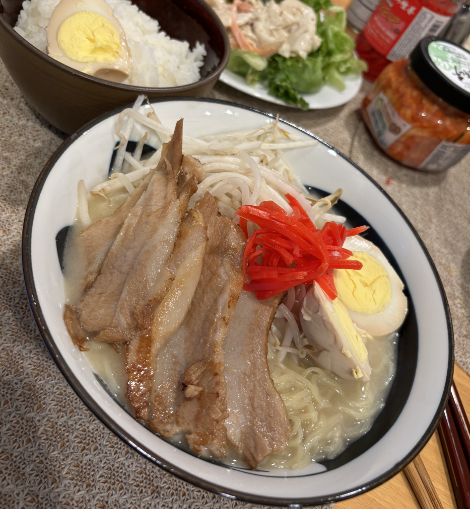 写真:冷凍とんこつラーメンに自家製豚トロチャーシューと煮卵トッピング
