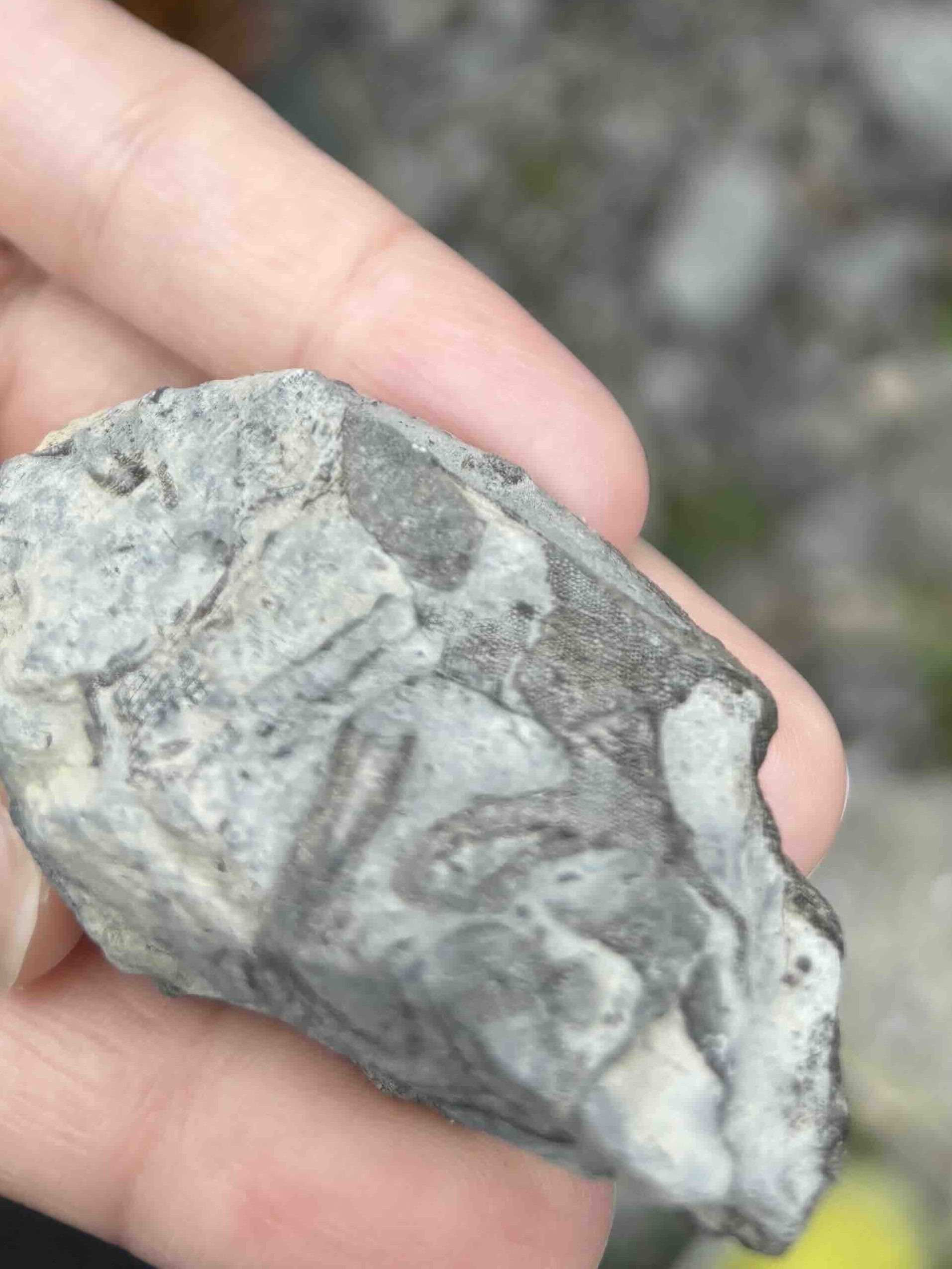 脇にある岩壁は一面ミルフィーユ状で、転がっている石にも何やら特徴的な模様が見受けられます